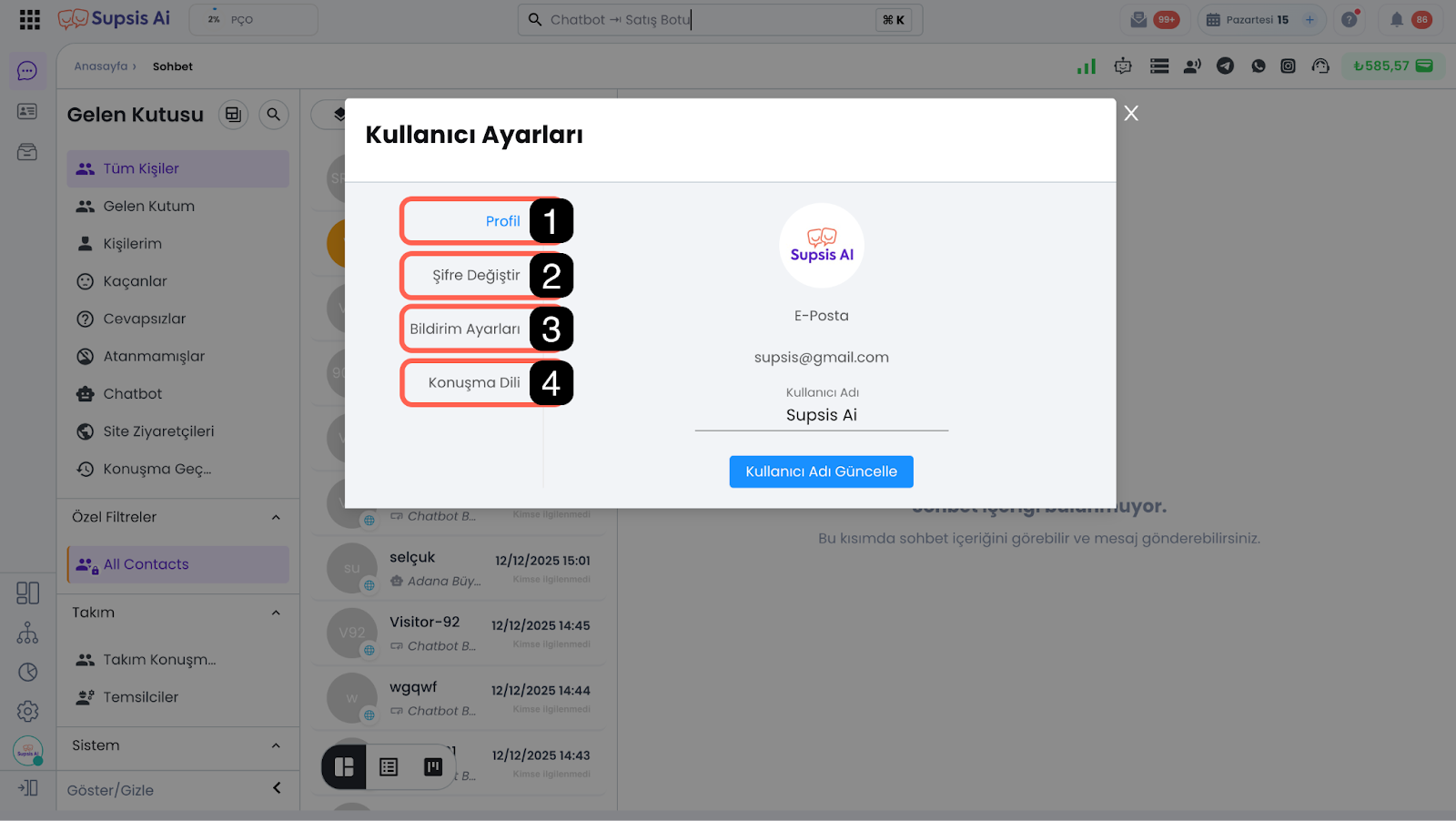 Profil ayarları ekranı üzerinden temsilci profil fotoğrafı ve kullanıcı adı özelleştirilebilir. Bu bilgiler; Supsis sohbet balonu üzerinden bağlantı gerçekleştiren müşterilerle etkileşimler sırasında, ekip üyeleri tarafından ve raporlama ekranlarında görüntülenir.