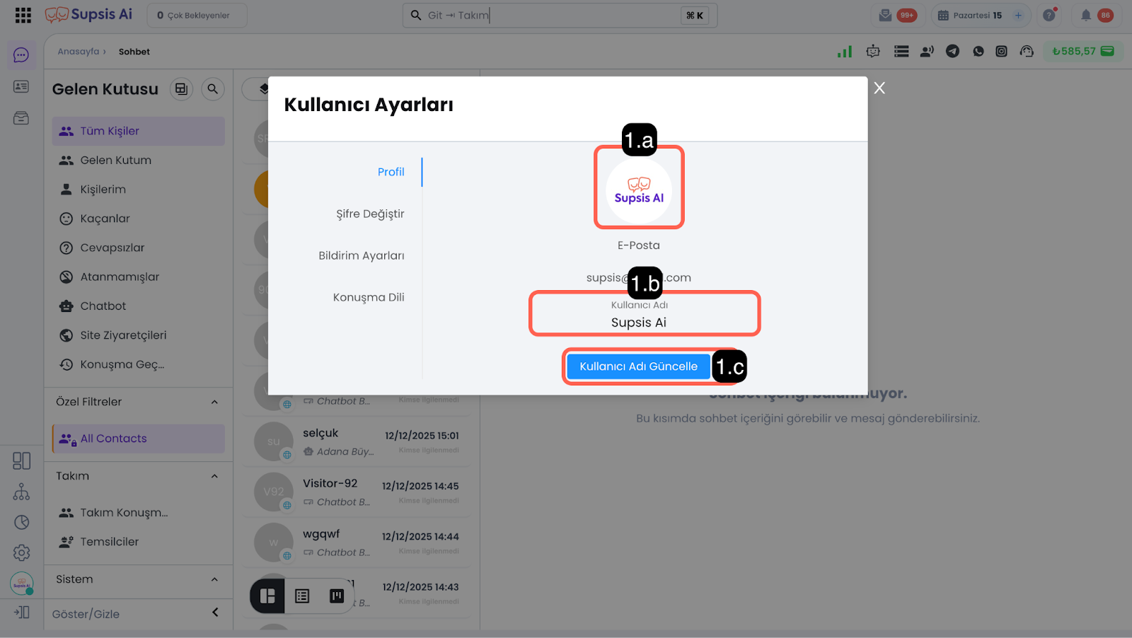 1.b ile işaretlenen alanda yapılan kullanıcı adı değişikliklerini kaydetmek için bu buton kullanılır. Güncelleme işlemi bu buton aracılığıyla onaylandıktan sonra yeni kullanıcı adı sistem genelinde geçerli olur ve ilgili tüm alanlara otomatik olarak yansıtılır.