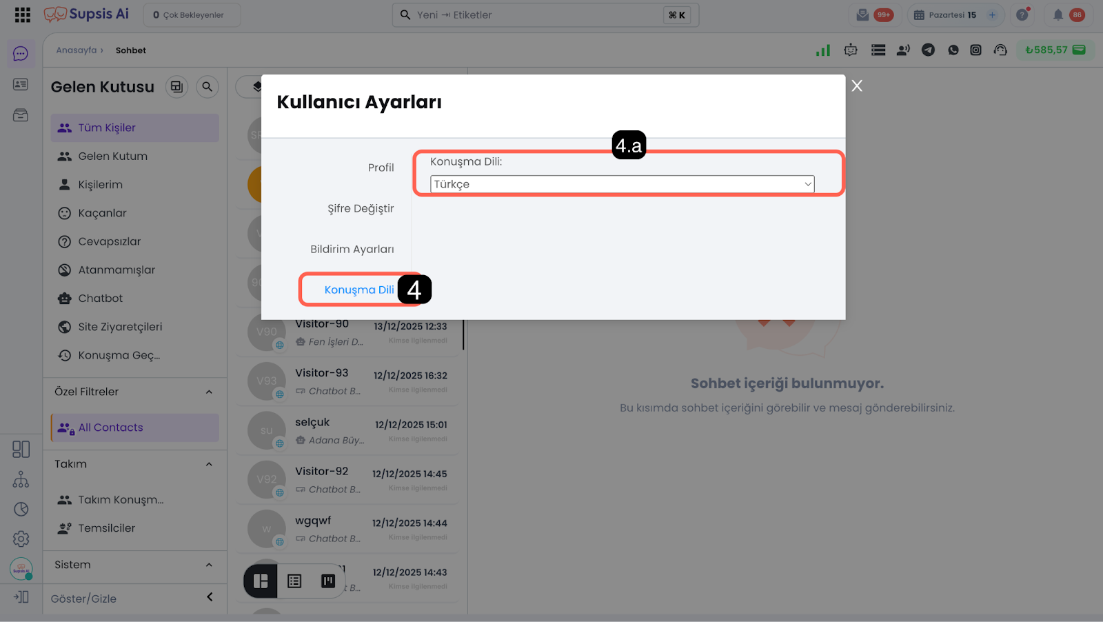 4.a – Dil Seçimi: Konuşma dilinizi, bu alanda bulunan açılır menü üzerinden seçebilirsiniz. Yapılan seçim temsilciye özel olarak kaydedilir ve otomatik çeviri işlemlerinde uygulanır.