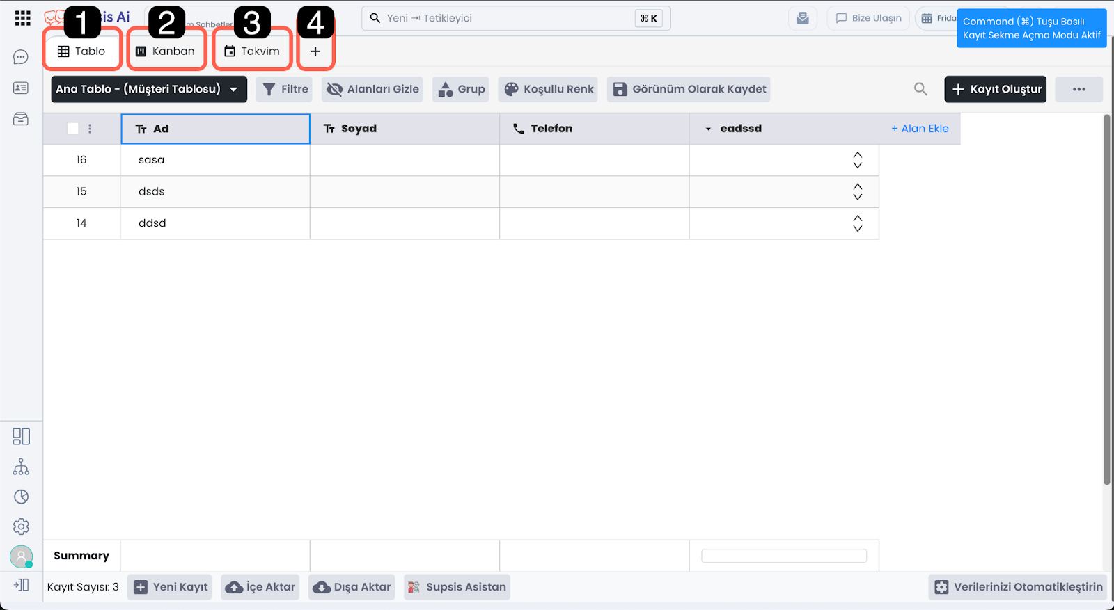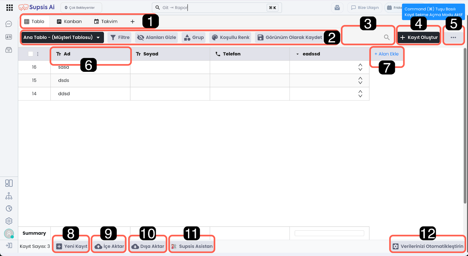 Tablo İçeriği alanı, oluşturduğunuz tablolardaki verileri görüntülemenizi ve yönetmenizi sağlar. Bu alan üzerinden tabloya ait veri setlerini düzenleyebilir, yapay zekâ asistan desteğiyle verileri analiz edebilir ve raporlayabilir, mevcut verilerinizi tabloya aktarabilir veya tablodaki verileri dışa aktarabilirsiniz.