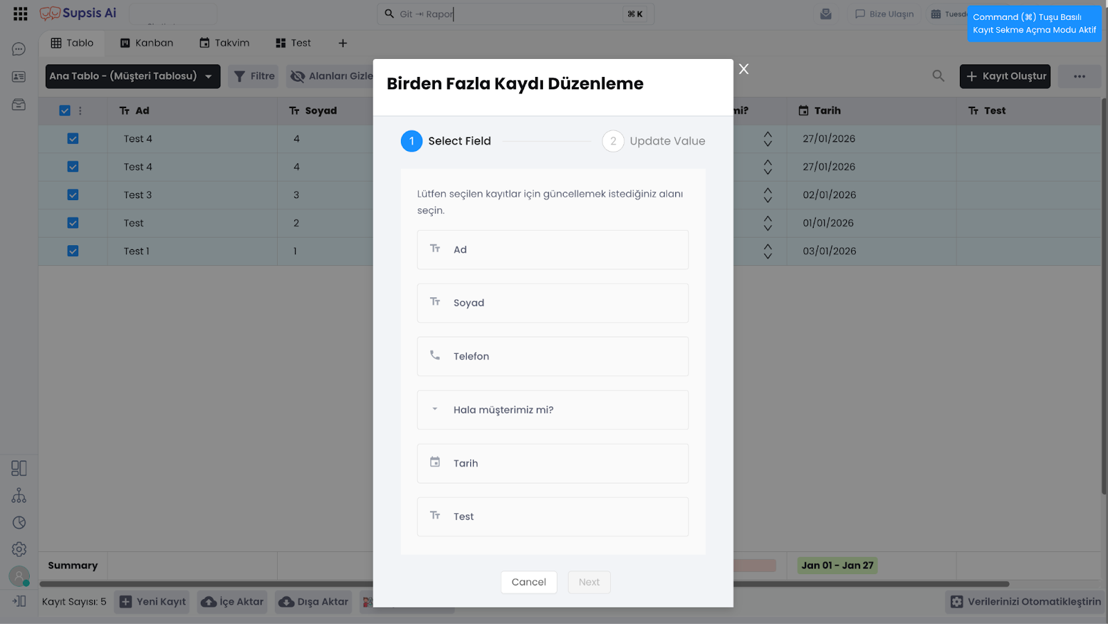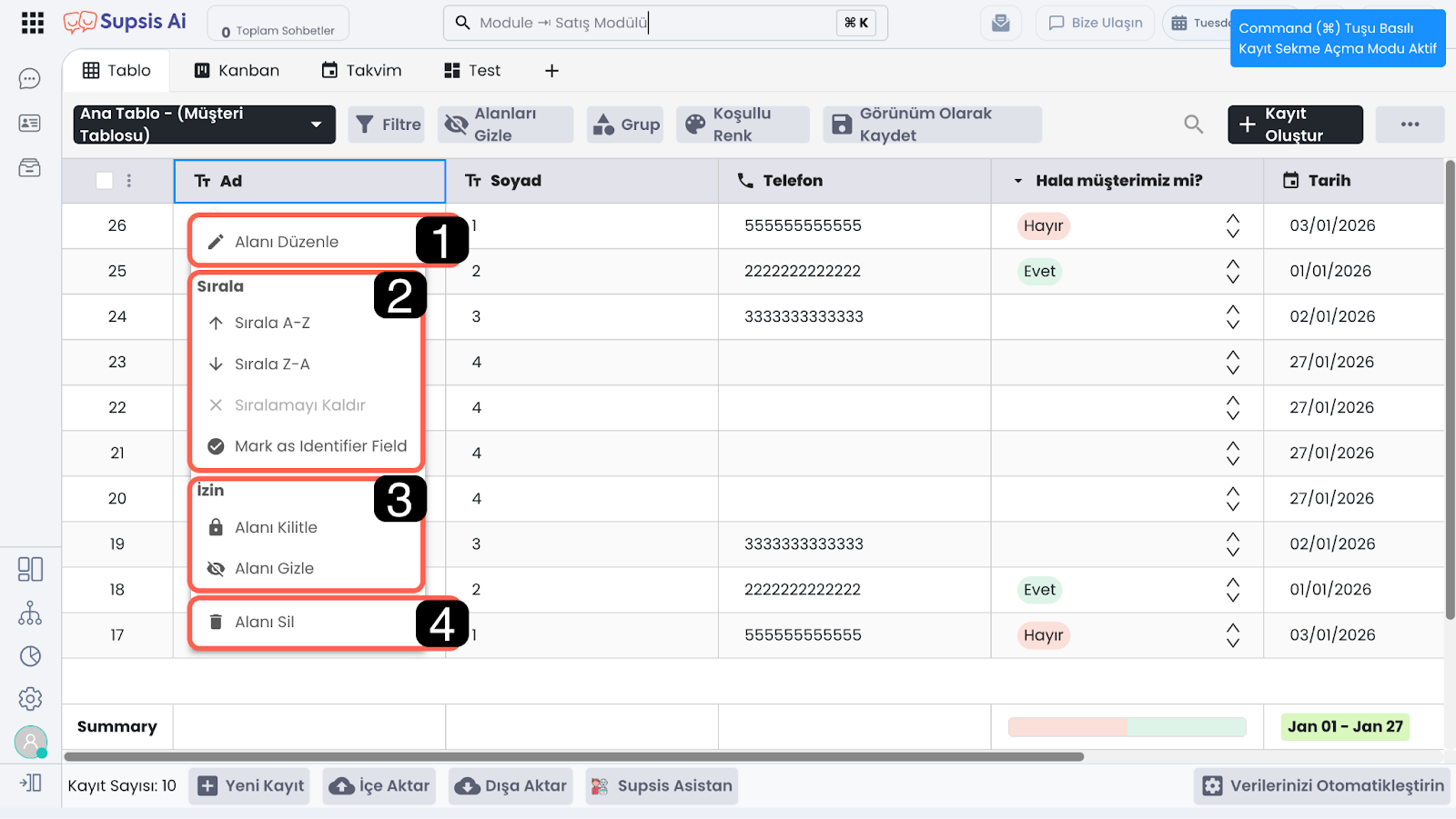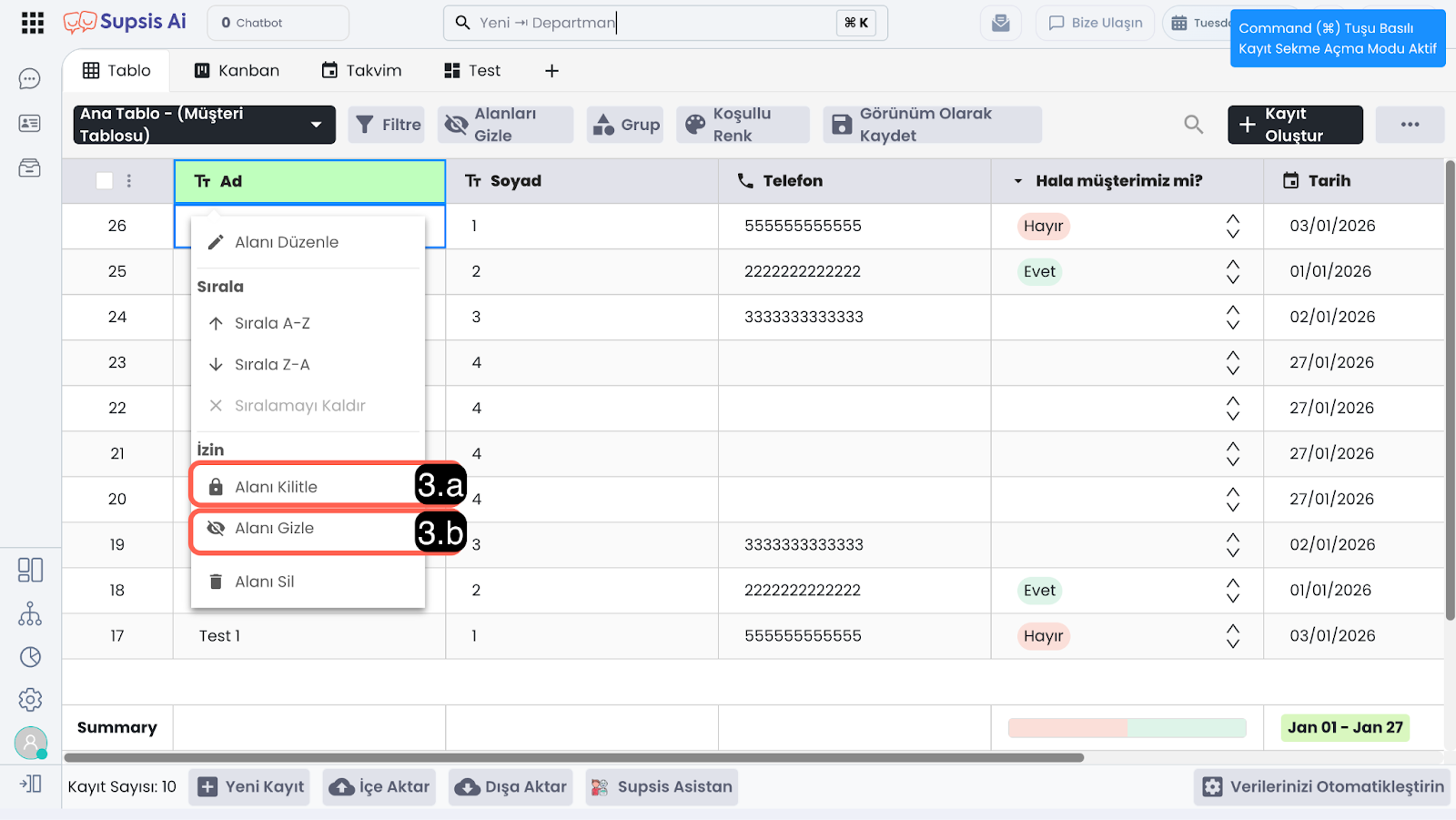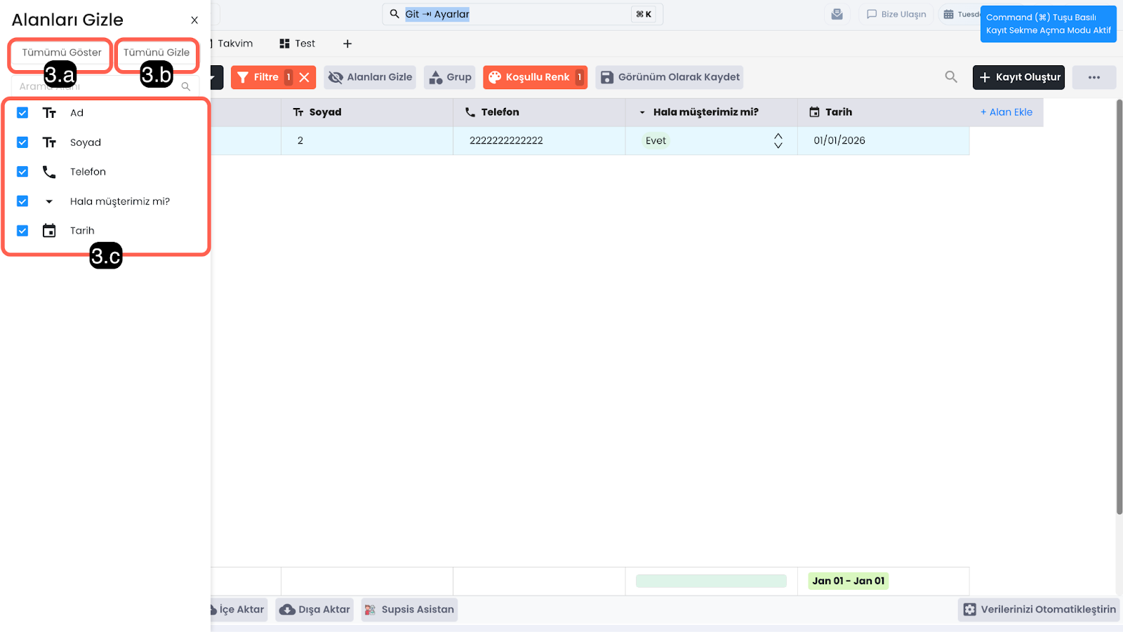 Alanları Gizle özelliği, tabloda görüntülenen sütunları geçici olarak gizlemenizi sağlar. Bu sayede gereksiz alanları kapatarak ekranı sadeleştirebilir ve yalnızca ihtiyacınız olan bilgilere odaklanabilirsiniz.
