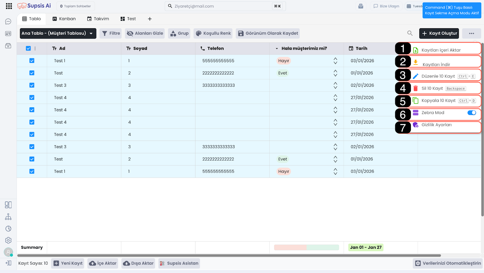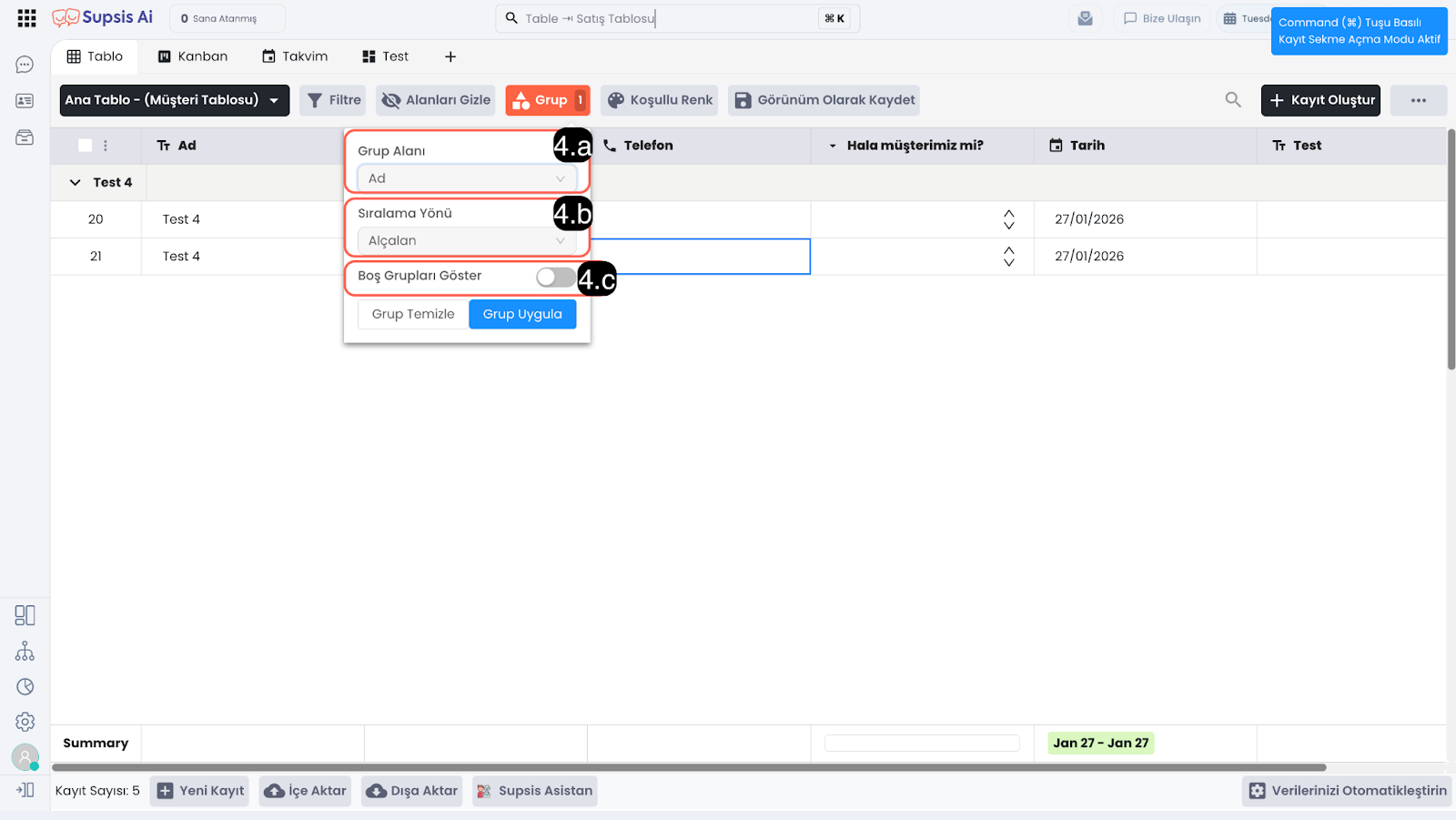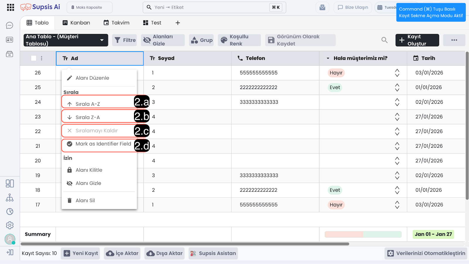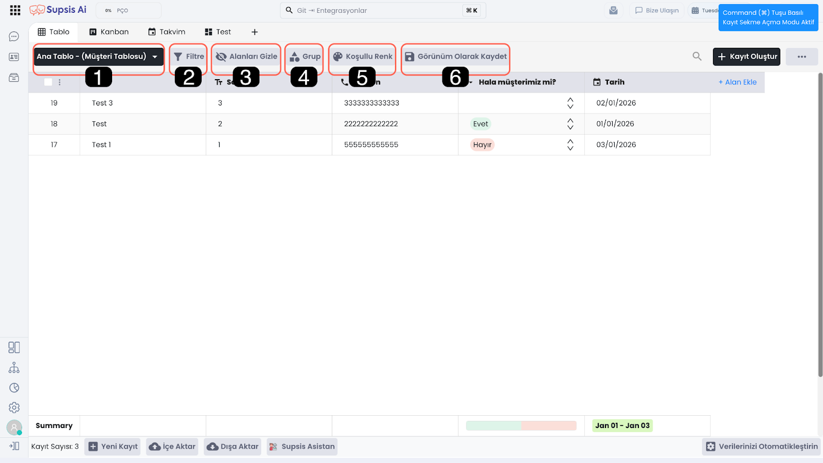 Alanları Gizle özelliği, tabloda görüntülenen sütunları geçici olarak gizlemenizi sağlar. Bu sayede gereksiz alanları kapatarak ekranı sadeleştirebilir ve yalnızca ihtiyacınız olan bilgilere odaklanabilirsiniz.