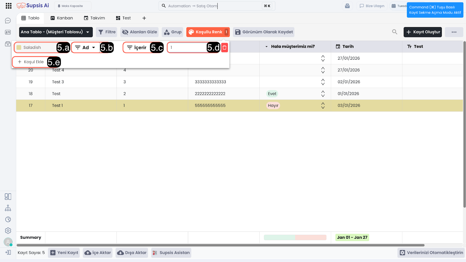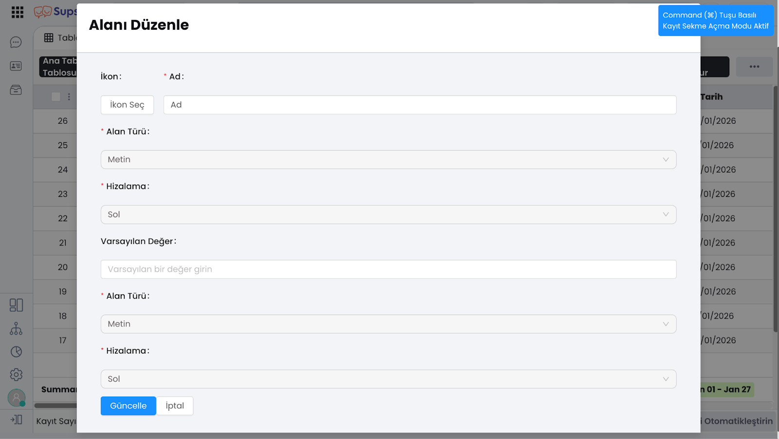 6.e - Otomasyon Butonu: tablonuzda bir alan olarak eklenir ve kullanıcılar bu butona tıklayarak otomatik işlemleri başlatabilir. Örneğin, bir veri girişi veya güncelleme yapıldığında, belirli aksiyonları tetiklemek için kullanılır.