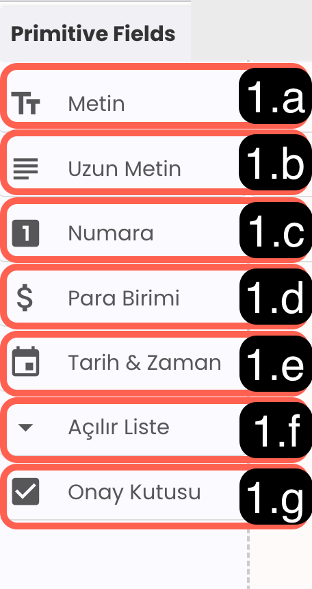 1.f - Açılır Liste: Önceden tanımlanmış seçeneklerden birini seçmek için kullanılır. Kategori veya durum bilgisi için uygundur.