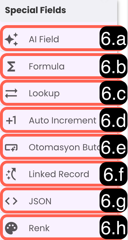 6.b - Formula: Hesaplamalı alan olarak kullanılır. Diğer alanlarda bulunan verilerle otomatik hesaplamalar yapılmasına olanak sağlar. Örneğin, sayısal değerler veya metinlerden yapılan hesaplamalar burada işlenebilir.