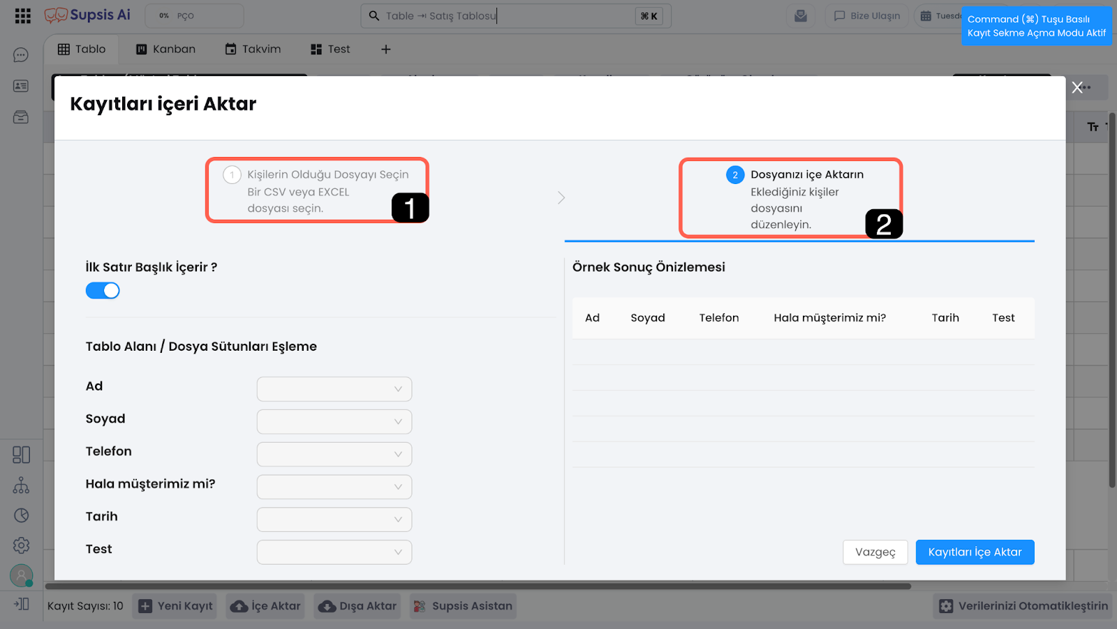 İçe aktarım işlemini yapacağınız belgenin içeriğini eşleştirme yapmanız gereken adımdır. Kendi belgenizle tablo alanlarını eşleştirmeniz gerekmektedir.