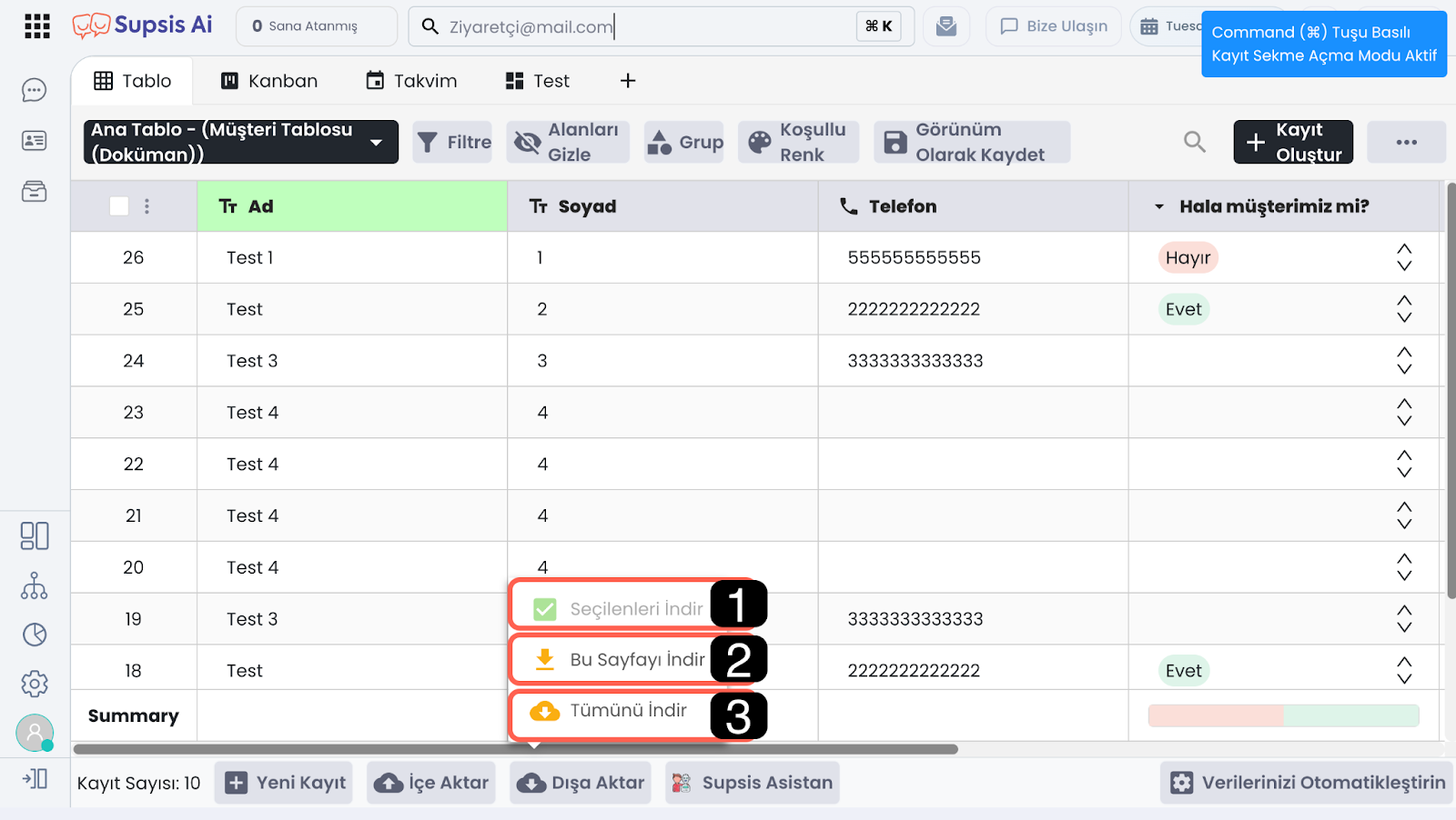 Sayfada listelenen kayıtları indirebileceğiniz seçenektir. Kayıt sayısı düzenlenerek istenilen sayıda kayıt indirilebilir.