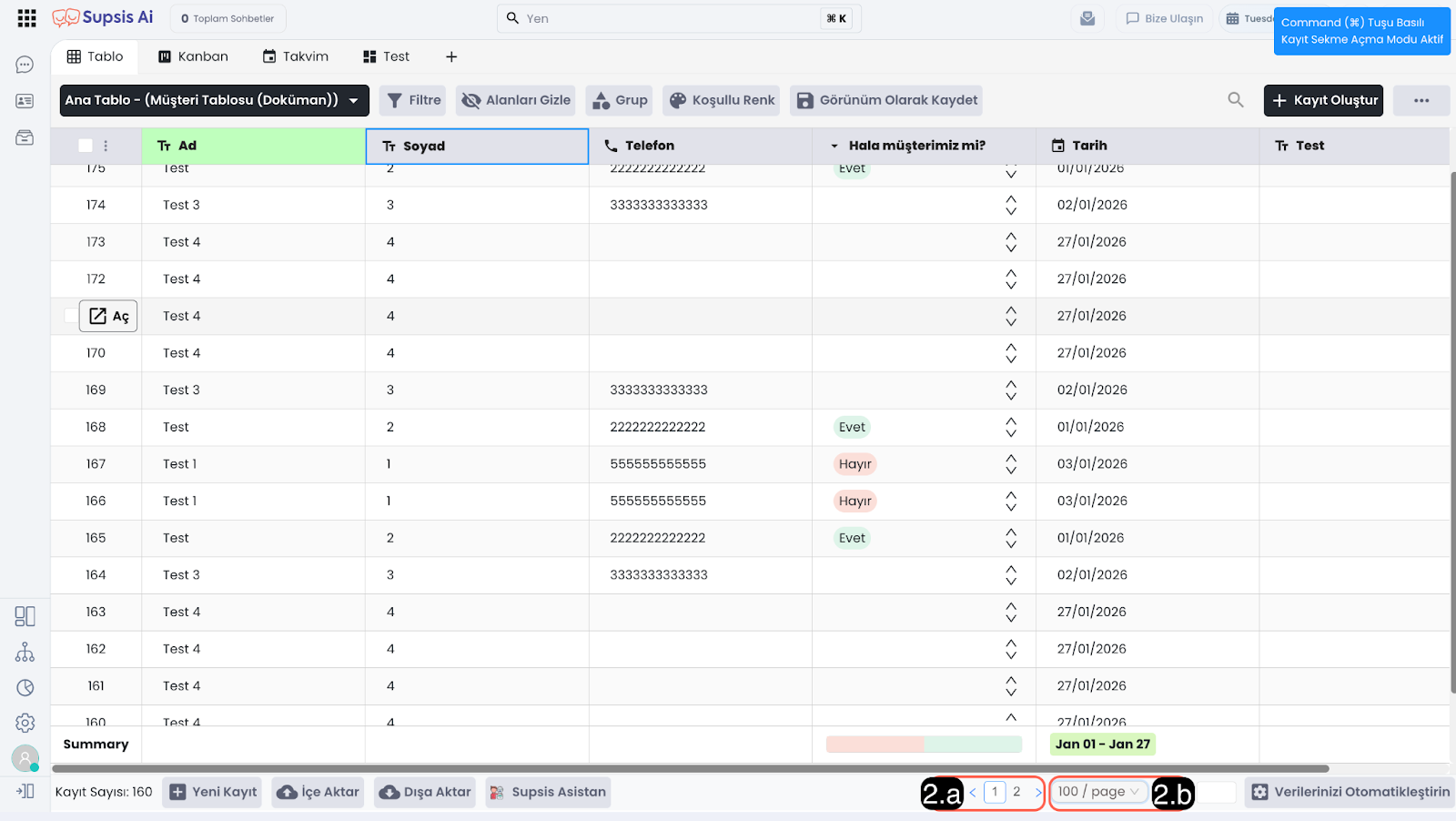 2.b - Kayıt/Sayfa: Tek bir sayfada kaç adet kayıt listelenebileceğini seçebileceğiniz alandır.