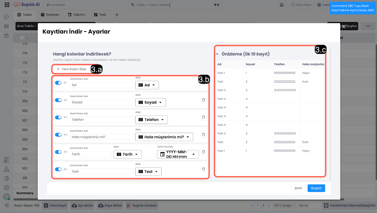 İndireceğiniz Excel belgesine yeni kolon ekler. Eklenilen kolonun ismini belirleyebilirsiniz, tablonuzda olan sütunlarla eklediğiniz kolonları eşleştirebilirsiniz.