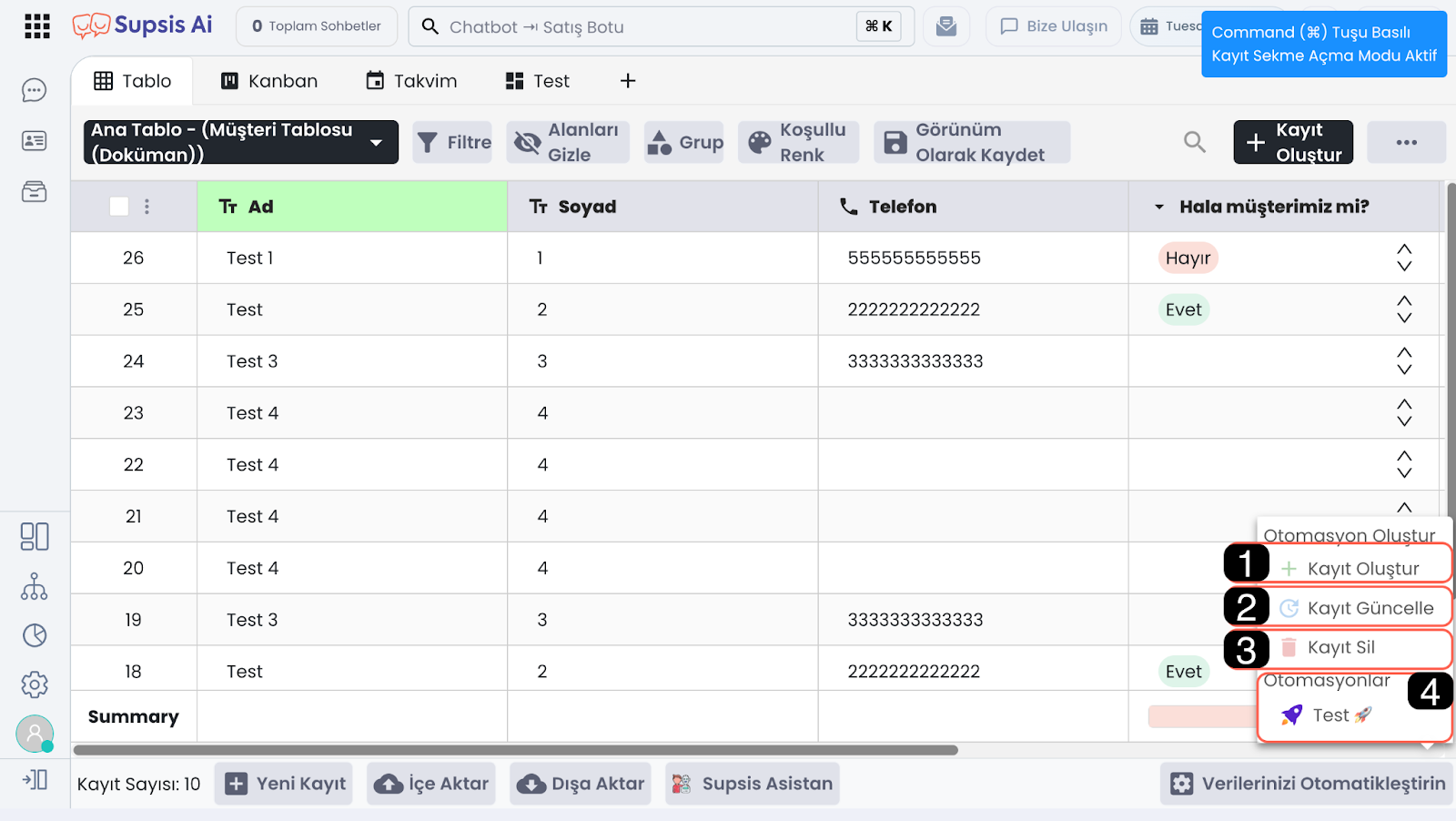 Bu buton aracılığıyla tabloyla entegre çalışan yeni otomasyonlar oluşturabilir ve tabloyla bağlantılı mevcut otomasyonlarınızı görüntüleyebilirsiniz.