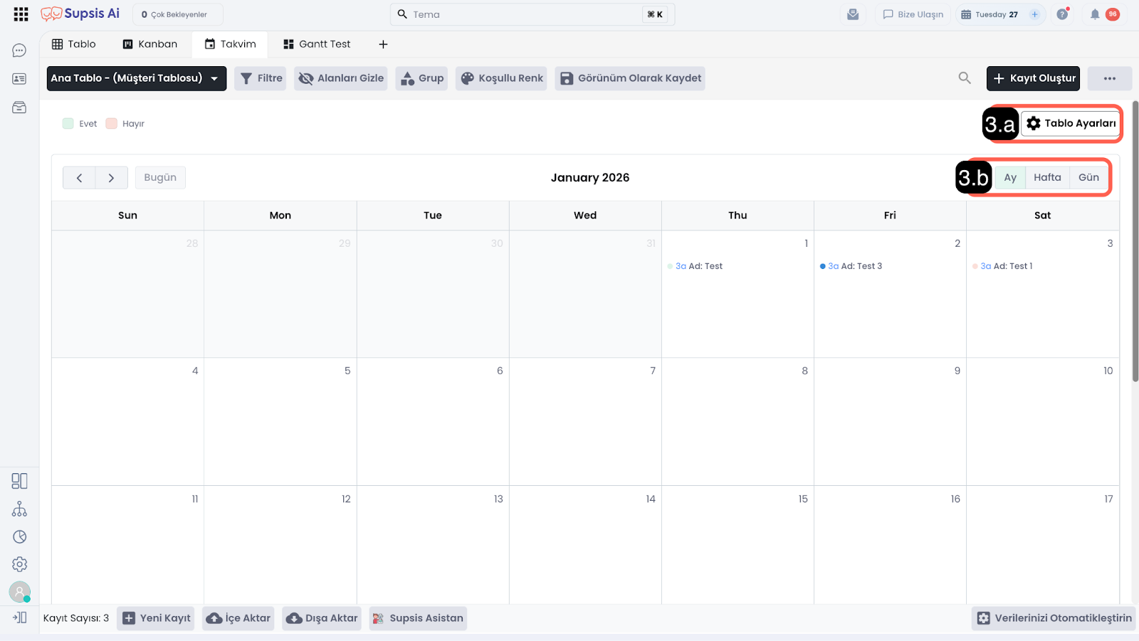 Takvim Görünümü’nü kullanabilmek için tabloda en az bir tarih alanı (sütun) bulunmalıdır. Tarih alanı bulunan tablolarda Takvim görünümüne geçildiğinde, veriler tarih bazlı olarak takvim üzerinde görüntülenir.