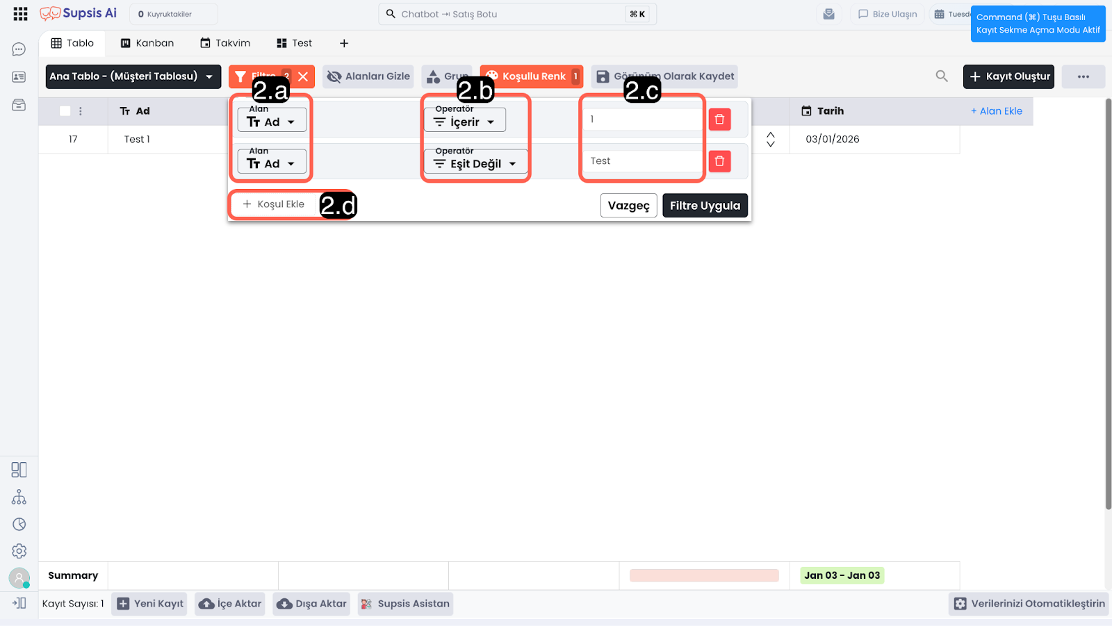 Filtreleme işlemi; alan seçimi, koşul belirleme ve değer girme adımlarından oluşur. İsterseniz tek bir koşul, isterseniz birden fazla koşul kullanarak filtreleme yapabilirsiniz.