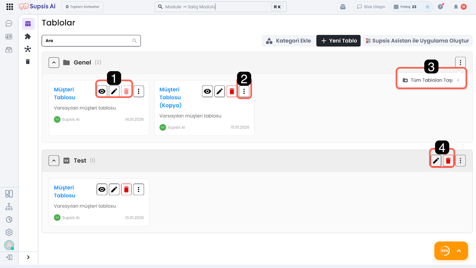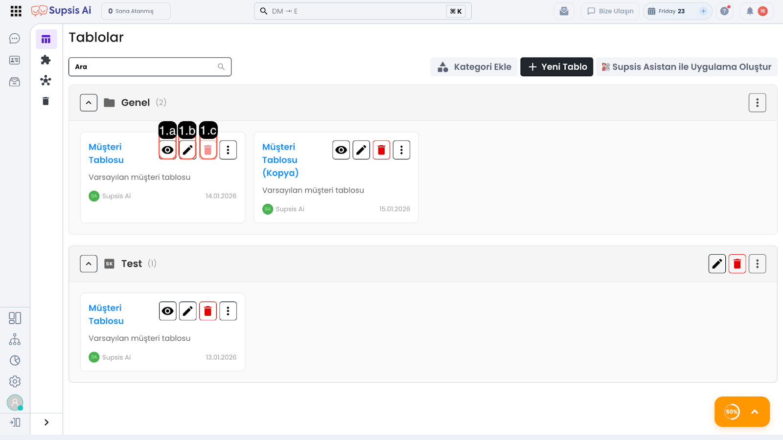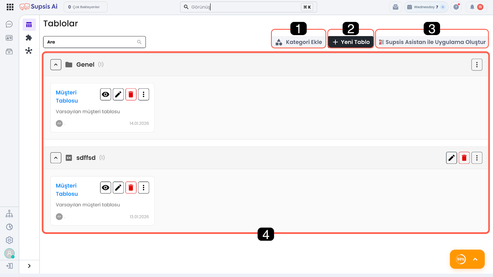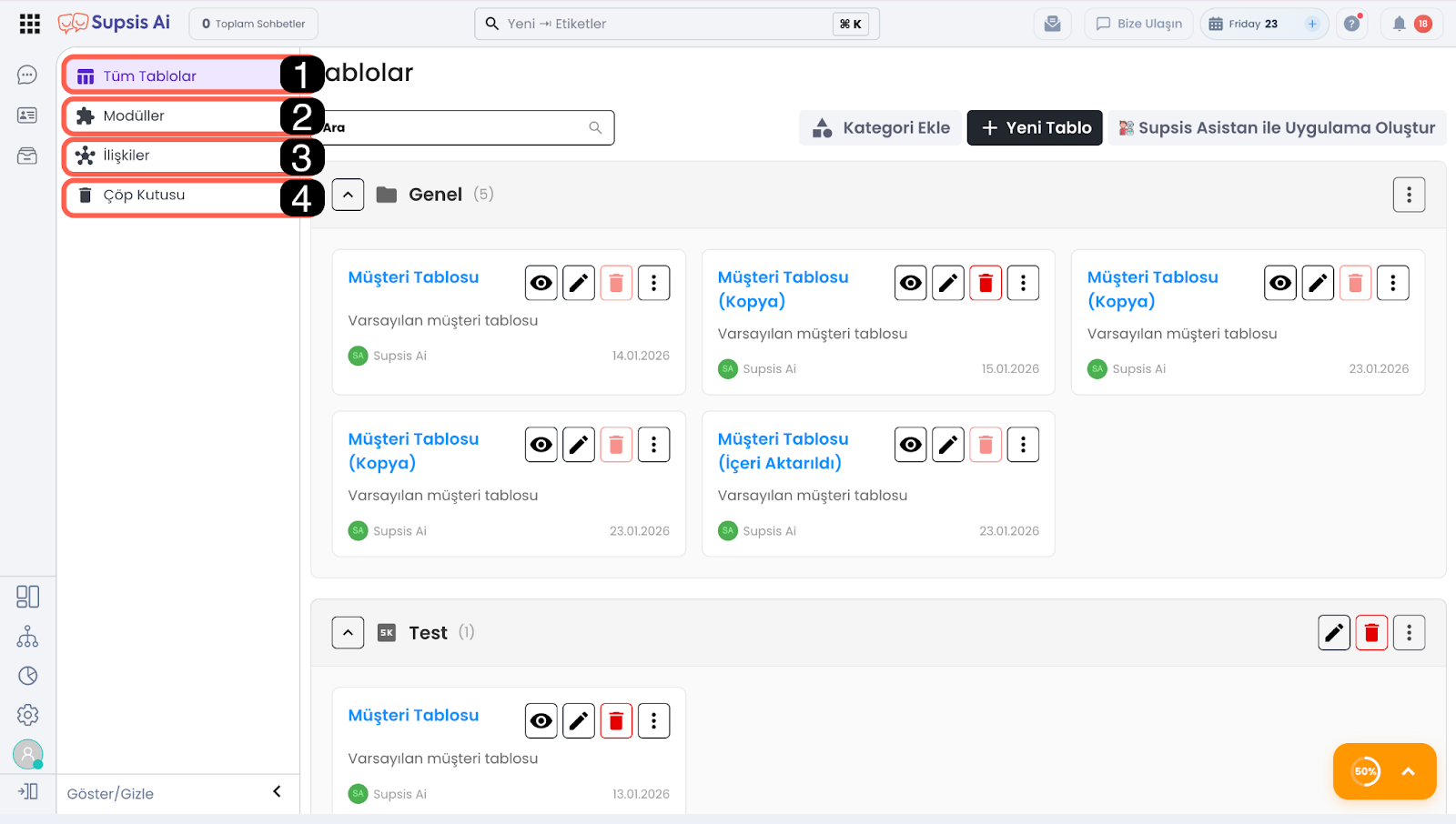 Bu alan üzerinden; yeni tablolar oluşturabilir, Supsis’in yapay zeka asistanına talimat vererek gelişmiş tablo uygulamaları kurgulatabilir, tablolarınızı düzenlemek ve sınıflandırmak için yeni kategoriler ekleyebilir, mevcut tablolarınızın içeriklerini görüntüleyebilir ve mevcut tablolar üzerinde düzenleme ve güncelleme işlemleri yapabilirsiniz.