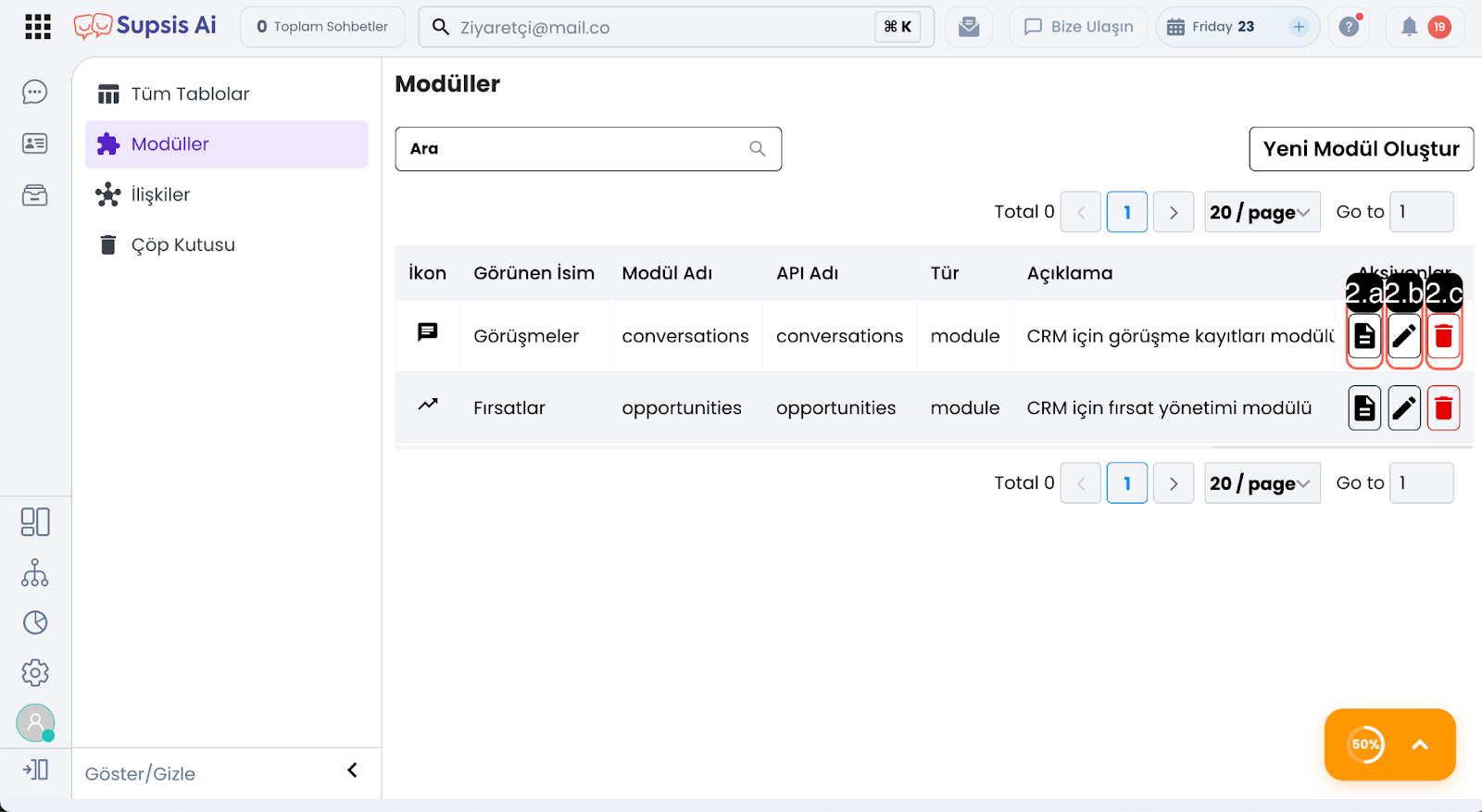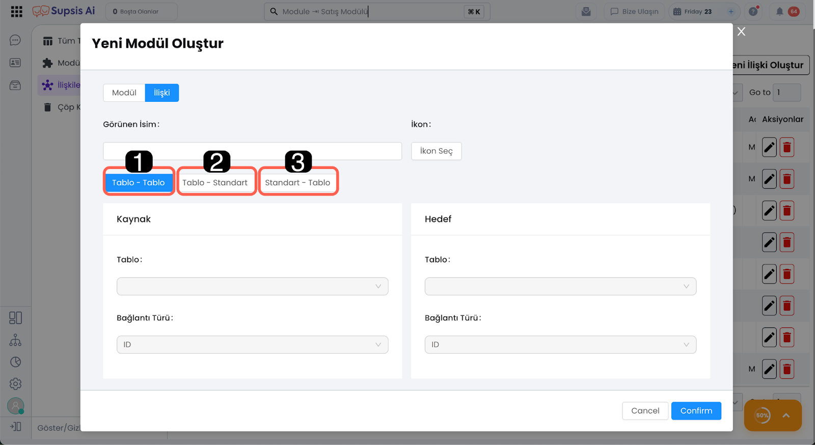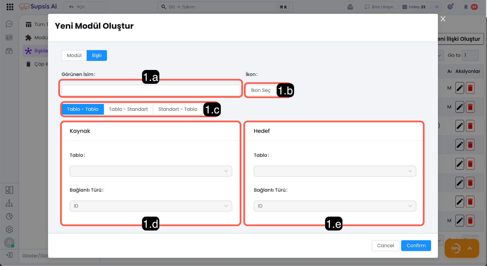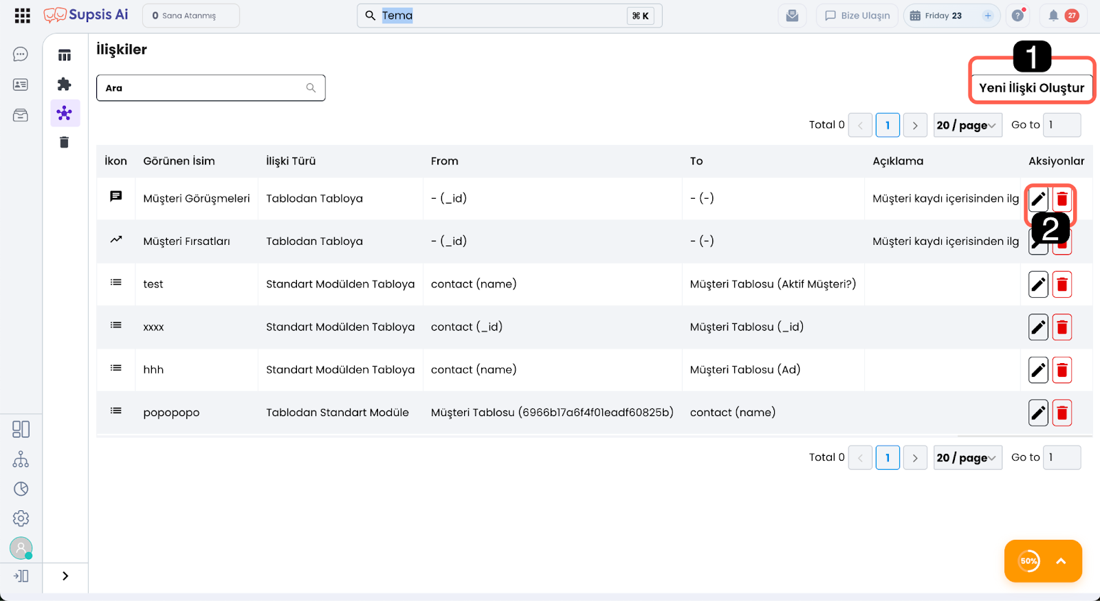 İlişkiler alanı, oluşturduğunuz tabloları birbirleriyle veya Supsis’in Standart Modülleri ile ilişkilendirmenizi sağlar.