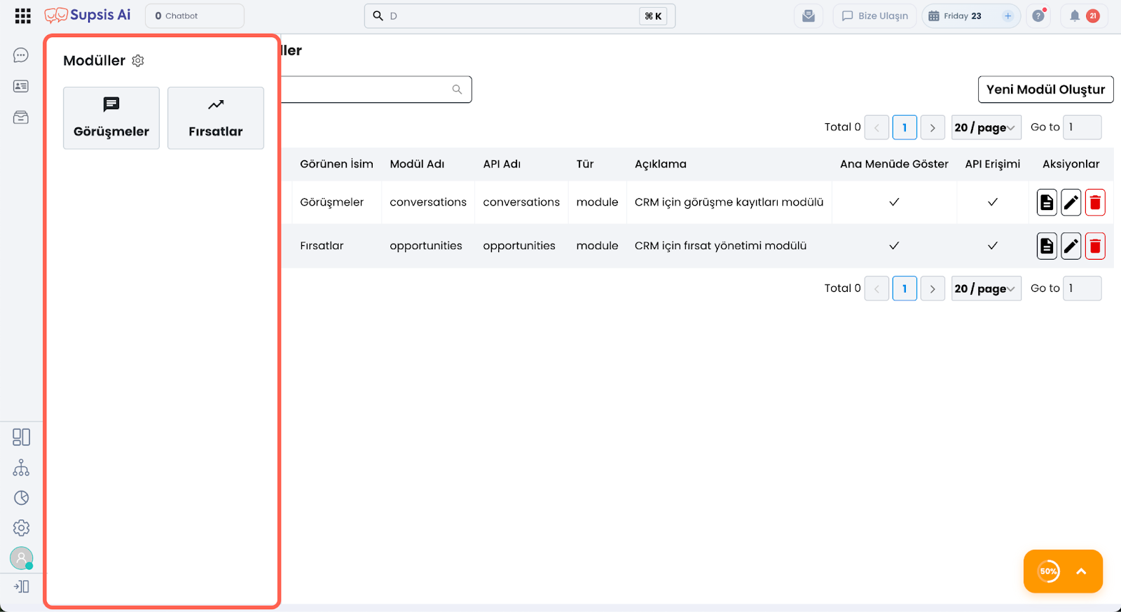 Özel olarak oluşturduğunuz bir tablodan, Supsis’in standart modüllerine erişim sağlar.