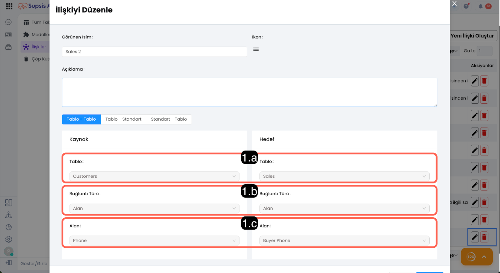 Bu alan üzerinden; mevcut ilişkileri görüntüleyebilir, yönetebilir ve yeni ilişkiler oluşturabilirsiniz. İlişkilendirme; seçtiğiniz ilişki yönüne bağlı olarak, hedef ile kaynak arasında bağlantı alanında belirlediiğiniz içeriğin eşleşmesi sonucu kaynağa hedefin diğer verilerini de getirir. Örneğin Müşteriler tablosunda ve Satışlar tablosunda ortak olarak telefon numarası bulunuyorsa ve ilişkilendirme telefon numarası üzerinden yapılırsa. Müşteriler tablosu üzerinden satış tablosundaki o müşterinin telefon numarasına ait kayıt detaylarına erişebilirsiniz