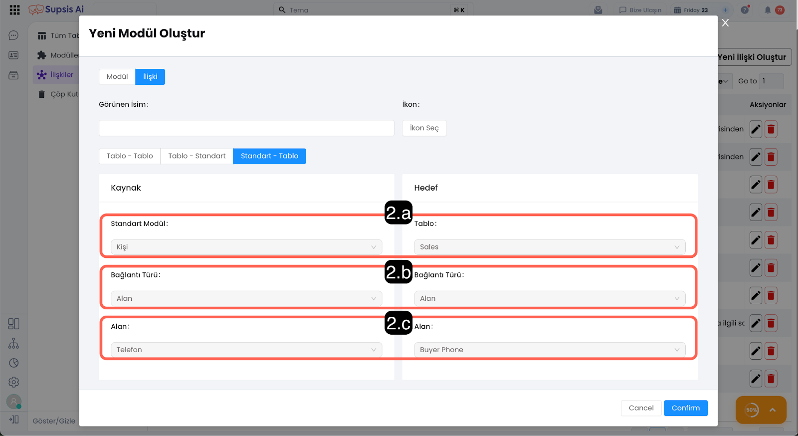 Akışımıza uygun olacak şekilde ilişkilendirilme sağlamak için kaynak kısmının Standart Modül kısmından, “Kişi” modülü seçilmelidir, hedef bölümündense Sales (Satışlar) tablosu seçilmelidir. Bu sayede yazan kişilerin profil kartındaki belirlenen alan, tablolardaki ilgili alanda eşleşme sağlandığında tablo içeriğine erişim sağlanabilir.