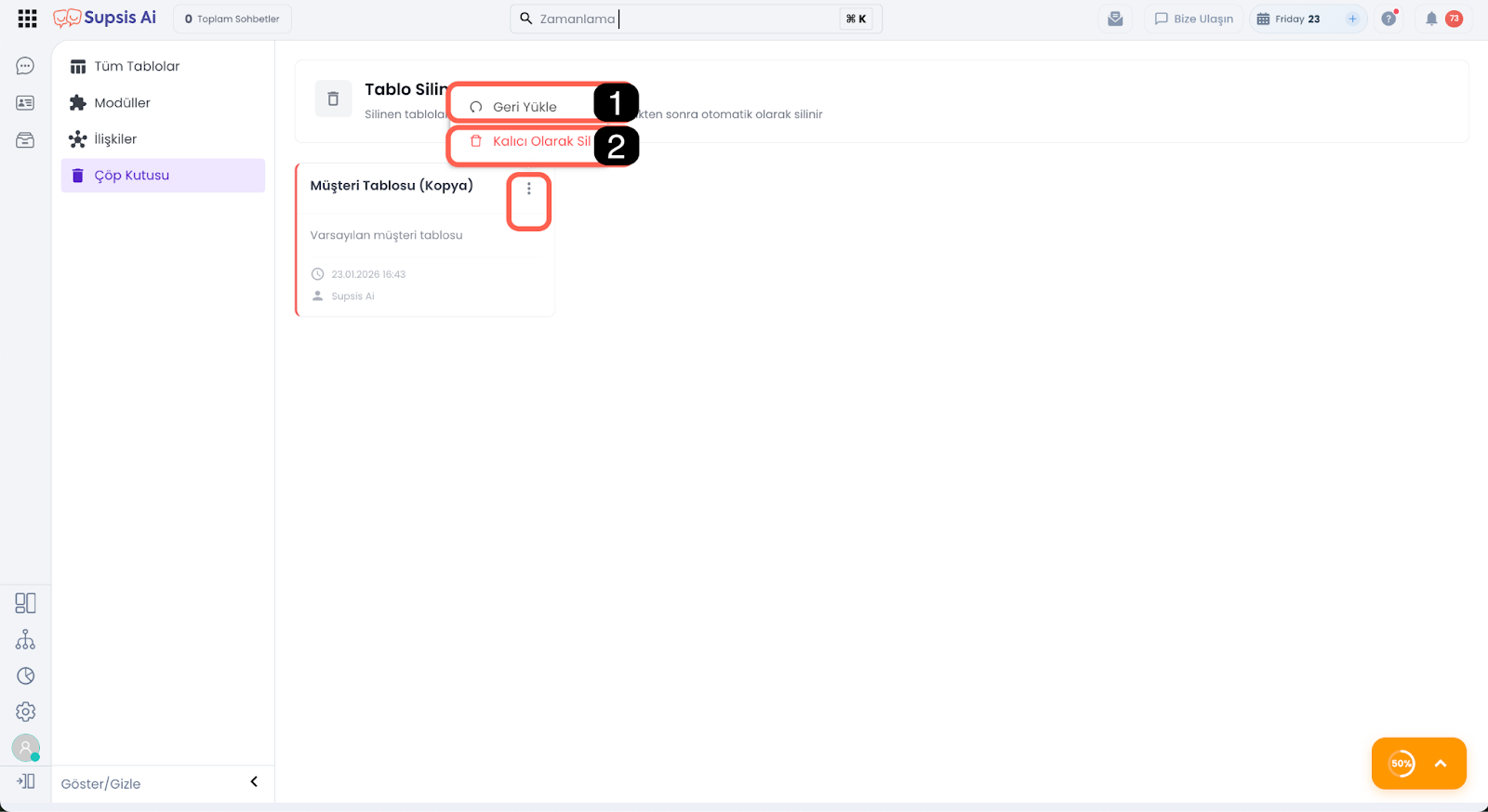 Sildiğiniz tabloları bu butonu kullanarak geri yükleyebilirsiniz. Çöp kutusunda bulunan tablolar geri yüklenmediği durumlarda 30 gün sonra otomatik olarak kalıcı olarak silinir.