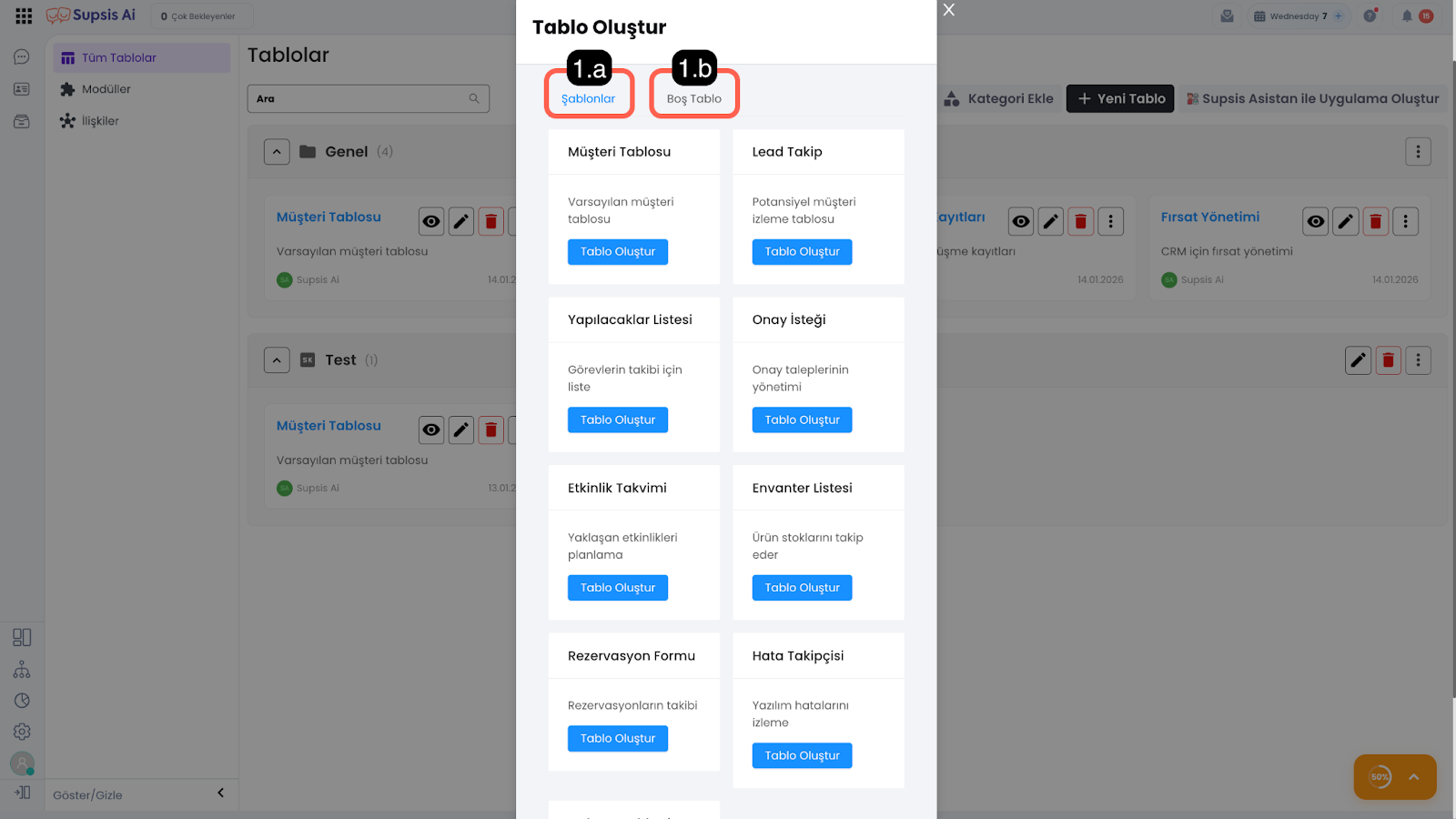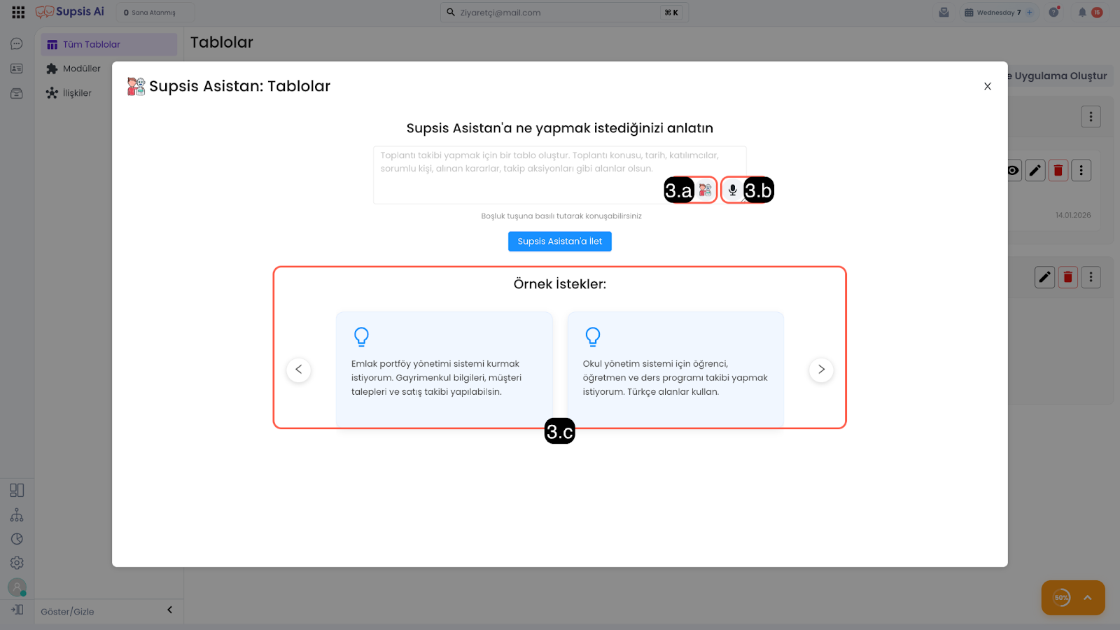 Bu seçenek, Supsis’in yapay zekâ asistanını kullanarak ihtiyaçlarınıza uygun tablolar ve bu tablolar üzerinden gelişmiş uygulamalar oluşturmanıza olanak tanır.