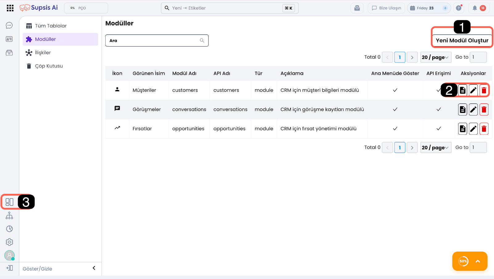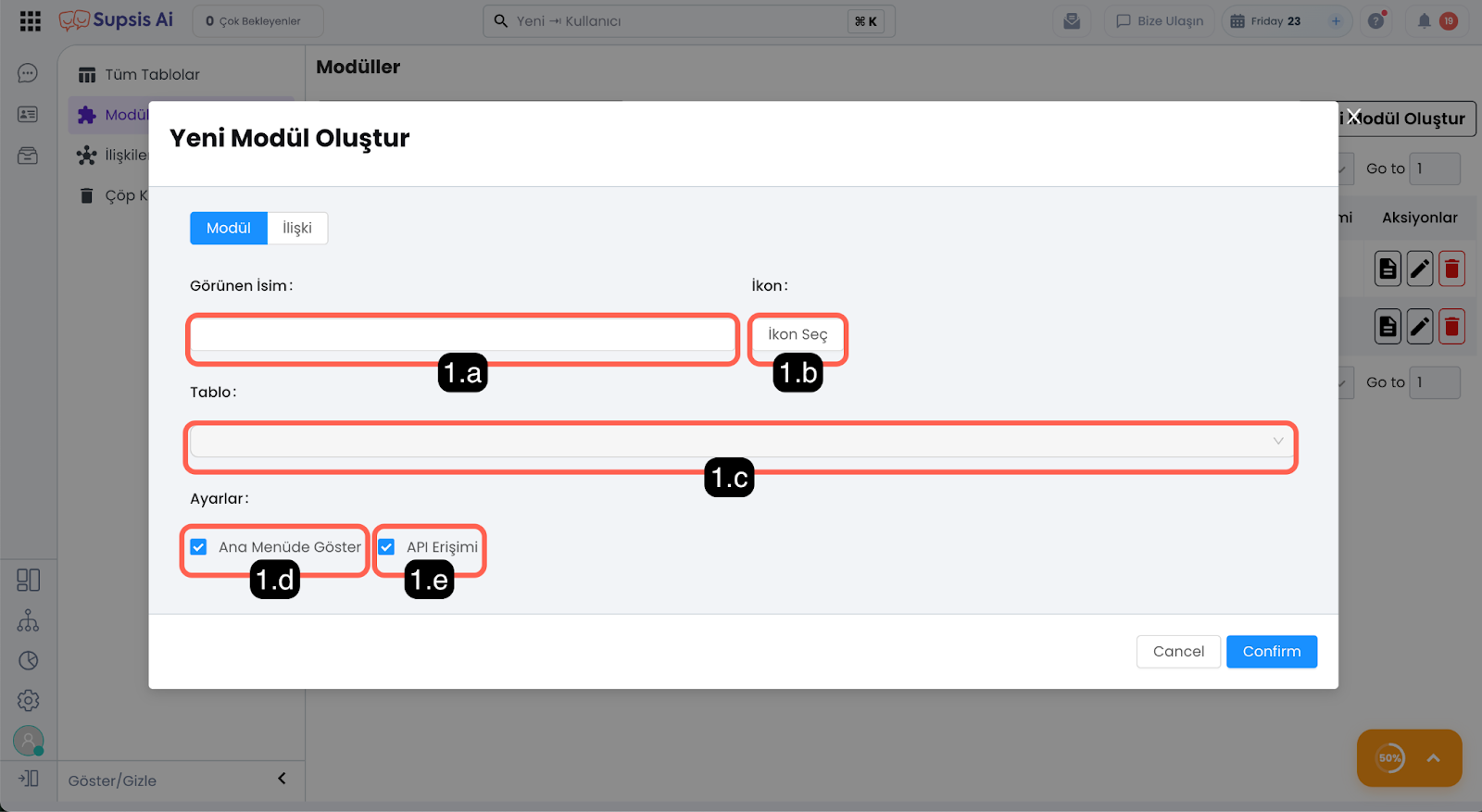 Bir tabloyu modülleştirmek, ilgili tabloyu: ana menüden kısayol ile erişilebilir hâle getirir, API üzerinden dış sistemlere açar, modülün menüde görünürlük kontrollerini yönetmenizi sağlar.