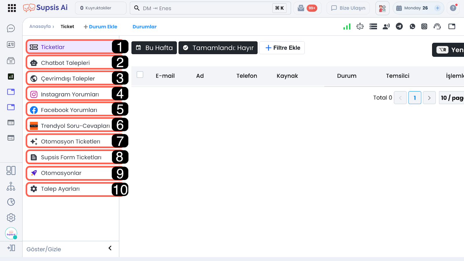 Ticketler Menüsü, tüm iletişim kanallarınızdan gelen müşteri taleplerini tek bir ekranda, düzenli ve kategorize edilmiş şekilde görüntülemenizi sağlar. Farklı kaynaklardan gelen talepler bu menü altında toplanarak destek süreçlerinizi kolay ve hızlı bir şekilde yönetmenize yardımcı olur.