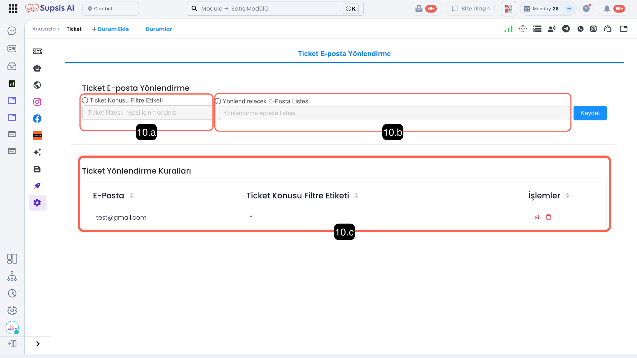 Talep Ayarları, oluşturulan ticket’ların belirlenen kurallar doğrultusunda belirlenen e-posta adreslerine otomatik olarak yönlendirilmesini sağlar. Bu alan üzerinden e-posta bildirim kurallarınızı kolayca yönetebilirsiniz.