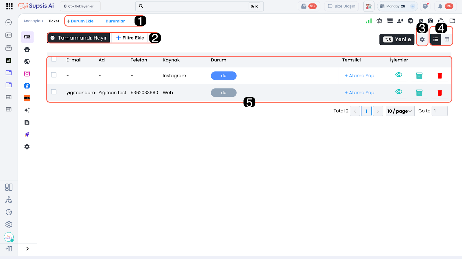 2.c – Durum: Ticket’lar mevcutta atanmış durumlarına göre listelenebilir.