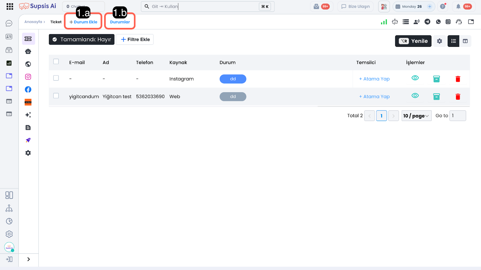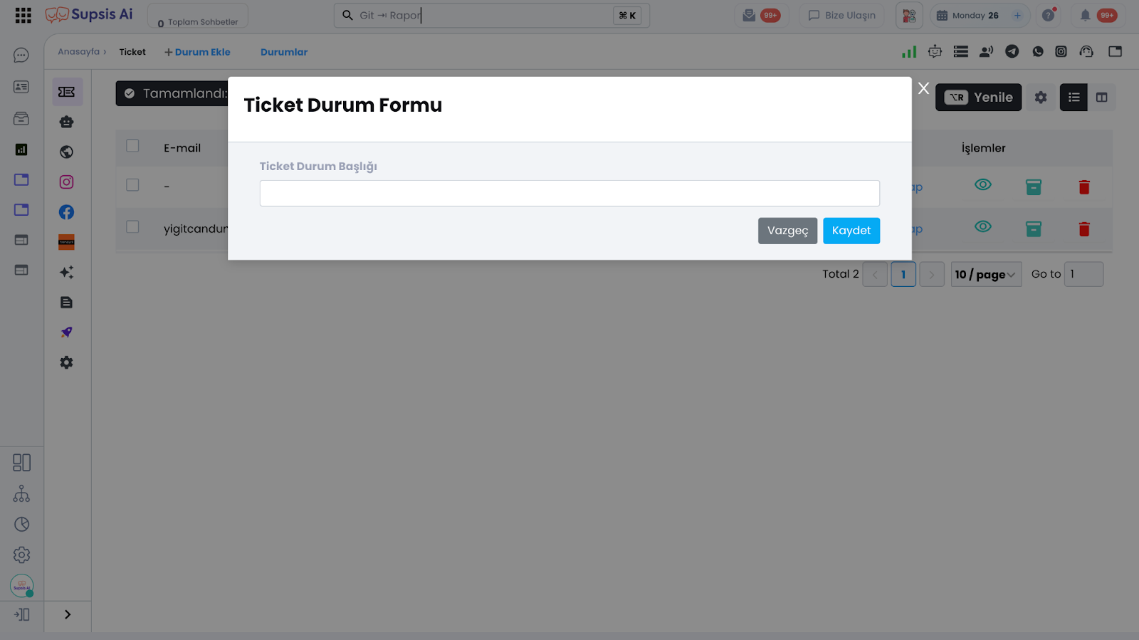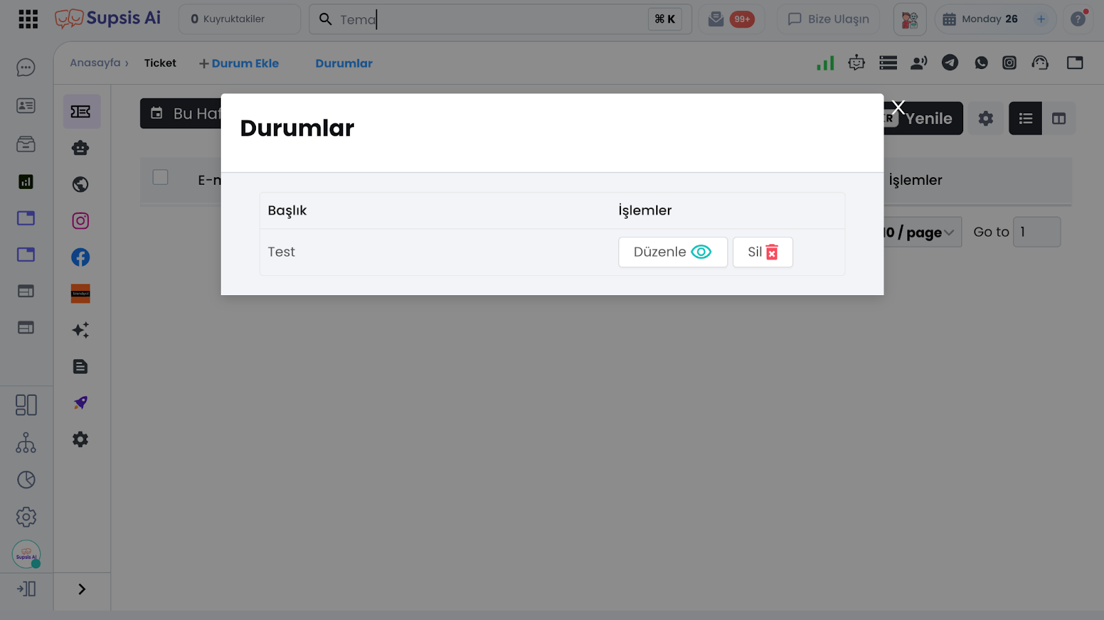 1.b – Durumlar: Mevcut ticket durumlarınızı bu alandan yönetebilirsiniz. - Durum adlarını düzenleyebilir, - Artık kullanılmayan durumları silebilirsiniz. Durum Yönetimi, ticket süreçlerinin esnek, düzenli ve ihtiyaçlarınıza uygun şekilde ilerlemesini sağlar.