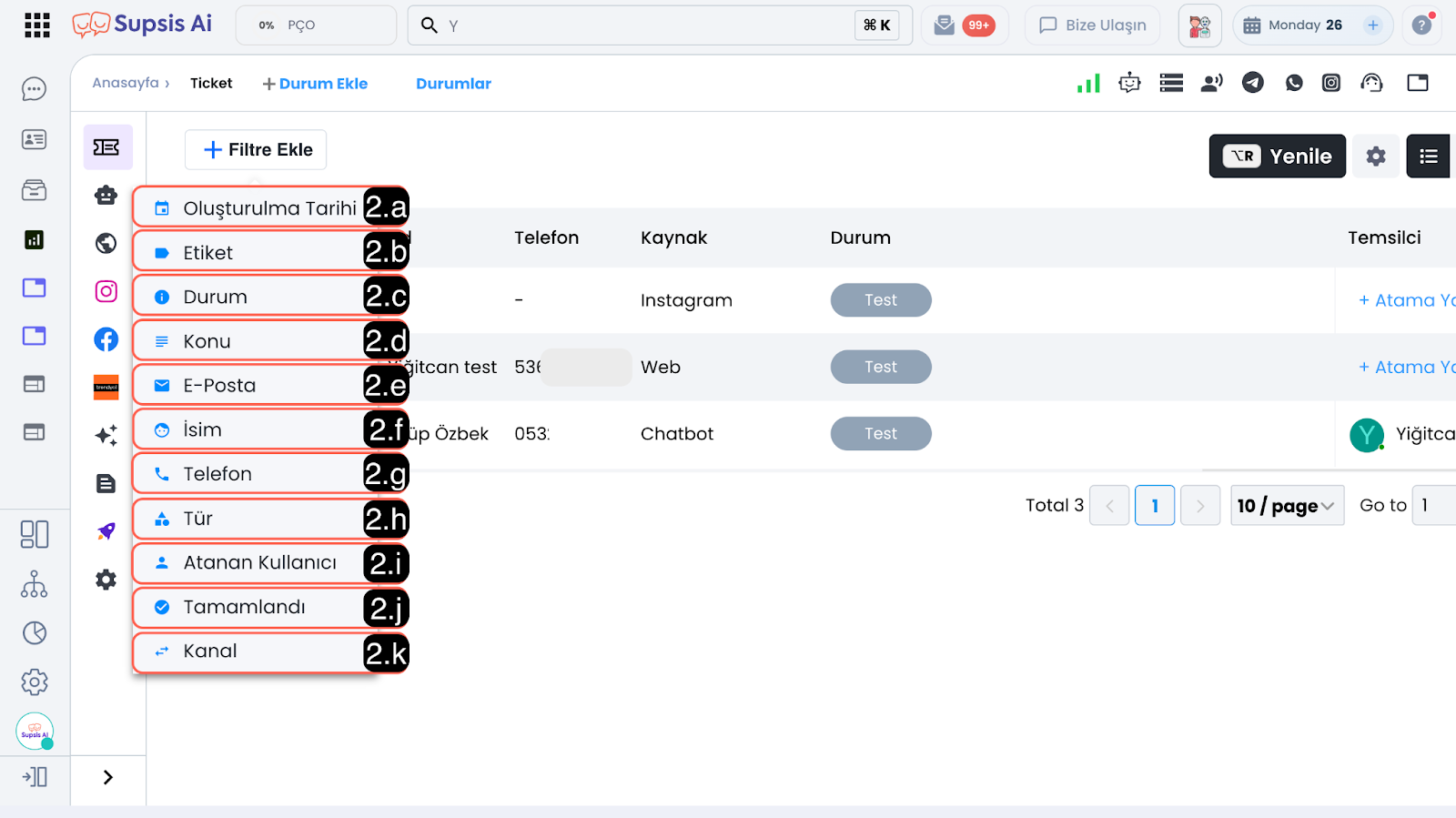 2.k – Kanal: Ticket’ın geldiği iletişim kanalına göre (Web, Instagram, Facebook, Chatbot, Trendyol vb.) filtreleme yapılabilir. Filtreleme yapısı, günlük operasyonlara hız kazandırır. Destek ekipleri, doğru talepleri daha kısa sürede bulur ve öncelikli işlere odaklanabilir.