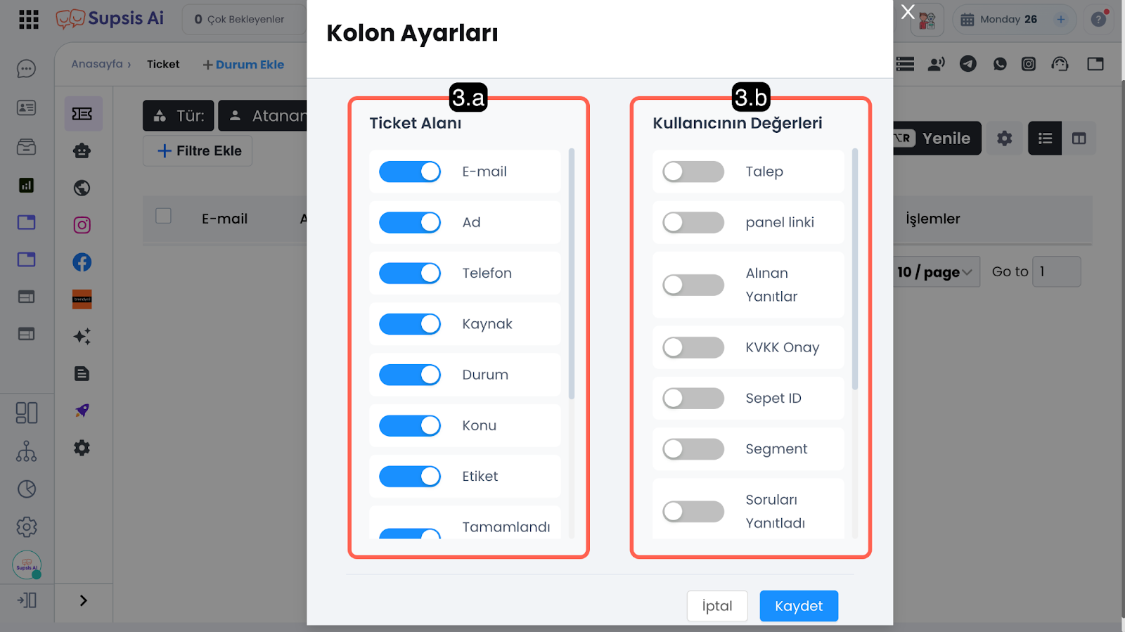 - Ticket listesinde görüntülenecek sütunları seçebilirsiniz,