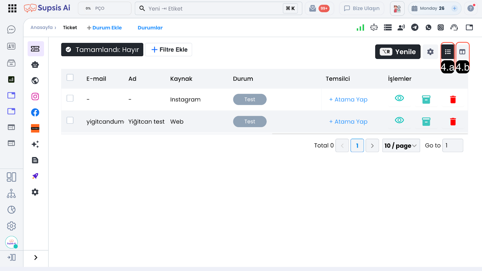 4.a - Liste Görünümü: Ticket’ların tablo yapısında detaylı şekilde listelendiği ana görünümdür. Filtreleme, toplu düzenleme gibi birçok işlem bu görünüm üzerinden gerçekleştirilir.