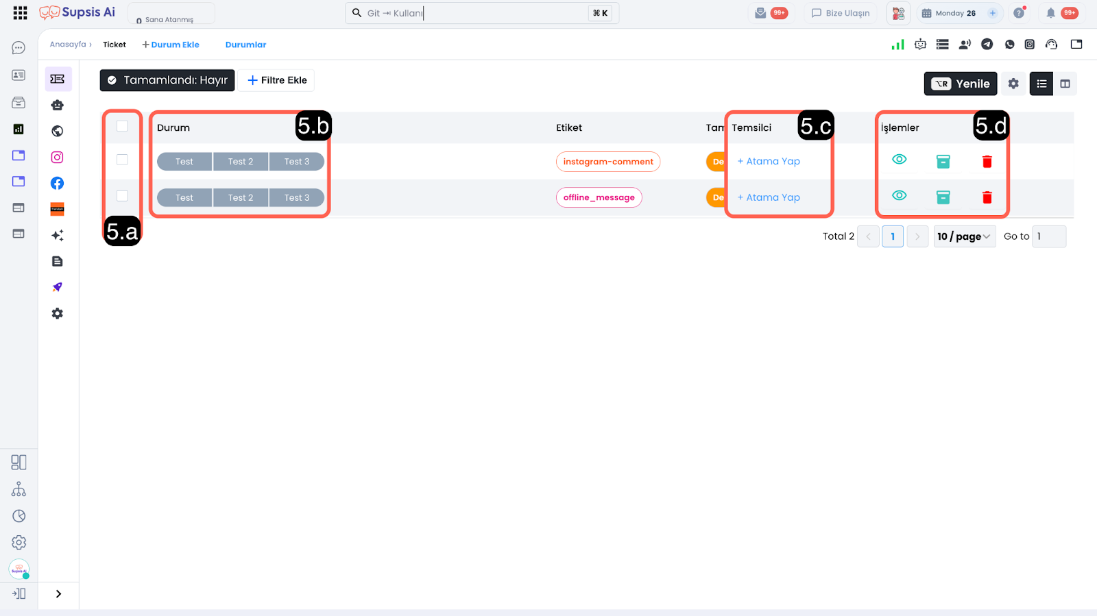 5.b - Durum: Durum alanı, seçili ticket’ların durumlarını tekli veya toplu olarak güncellemenizi sağlar.